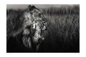 In my image titled “Free Ride,” I capture a tender moment between a lioness and her young cub as she carries him effortlessly across the golden savanna. This intimate scene beautifully illustrates the bond between mother and child, showcasing the nurturing instincts that define lion families.
