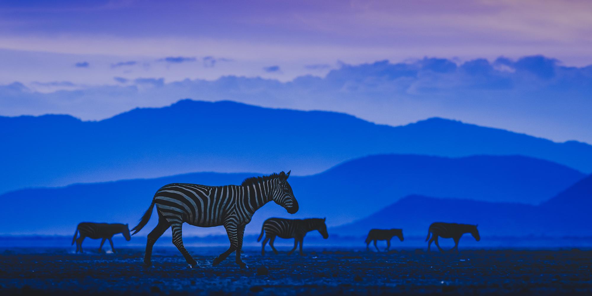 In Twilight Crossing, I capture a herd of zebras as they traverse the dry lake bed of Amboseli, a place where the harsh African landscape meets the twilight’s serene glow. This image embodies the fleeting beauty of the transition between day and night, a moment when the world pauses before the shadows deepen and the coolness of night takes hold. The zebras, silhouettes against the fading light, move with a quiet purpose across the cracked earth, their dark and light stripes blending with the shifting hues of the landscape.