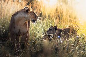 In the golden light of the Masai Mara, a mother stands as both protector and guide, her presence a quiet yet unwavering force. This image captures an intimate moment between a lioness and her cub—an unspoken exchange of trust, knowledge, and devotion.