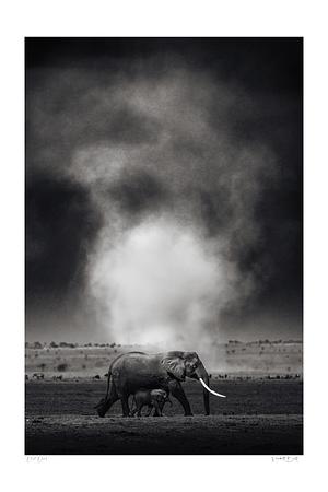 In my piece “Dust Devil,” I depict a powerful moment between an elephant mother and her calf as they navigate the unpredictable landscape of Amboseli, where a dust devil swirls behind them. This image captures not only the physical act of protection but also the deep bond and instinctual love that exists between these magnificent creatures.