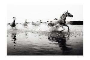 The blurred lines create a dreamlike quality, emphasizing the horses' powerful movement and grace while highlighting their connection to the vibrant landscape of the Camargue. Each horse becomes a symbol of freedom, resilience, and the untamed beauty of nature, reflecting the rich heritage of the region.