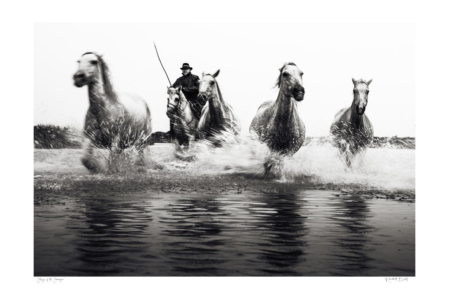 This image captures the primal energy of the Camargue horses as they rush toward the lens, driven by the skillful command of a French Gardian. The Gardians, traditional cattle herders of the Camargue region, represent a centuries-old way of life, where man and horse work in perfect harmony. The motion blur in this image reflects the unstoppable force of the horses’ gallop, pulling the viewer into the scene and evoking the sensation of being amidst the thunderous charge. This piece encapsulates the raw power of nature, the spirit of the horses, and the timeless bond between the Gardians and their herd. My goal is to evoke a sense of exhilaration and connection to the untamed wilds of the Camargue, where tradition and nature are interwoven in every hoofbeat.